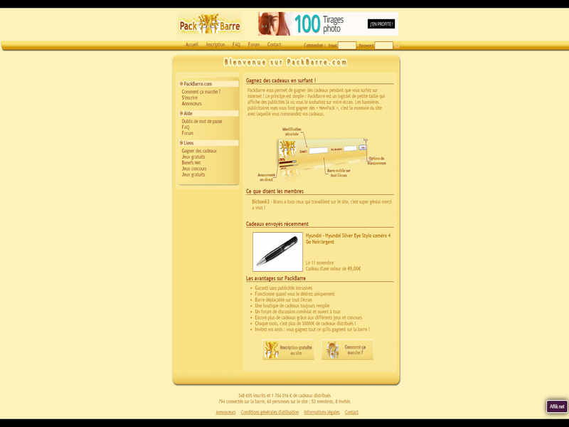 PackBarre vous permet de gagner plein de cadeaux pendant que vous surfez sur le net ! Le principe reste simple : vous téléchargez la Pack barre qui est un logiciel de petite taille qui affiche des pub là où vous le souhaitez sur votre écran. Les bannières publicitaires vues vous font gagner des NewPack qui est la monnaie du site avec laquelle vous commandez vos cadeaux. Déjà plus de 350.000 inscrits et presque 2 millions d'euros de cadeaux distribués. Le taux de parrainage est de 100% des gains filleuls au 1er niveau. Le seuil de paiement se fait à partir de 5 euros avec un nombre de points par heure est de 20 pour un taux pour 1000 points : 0.10 euros. Plein de codes aussi sont à gagner : Pack+, Tipass, RoyalPass, Ilokod,Youpipass, Servcode, Choco+,Boopass, QuestPack,AlienZ'+, Galactikode, Lipalacode etc...